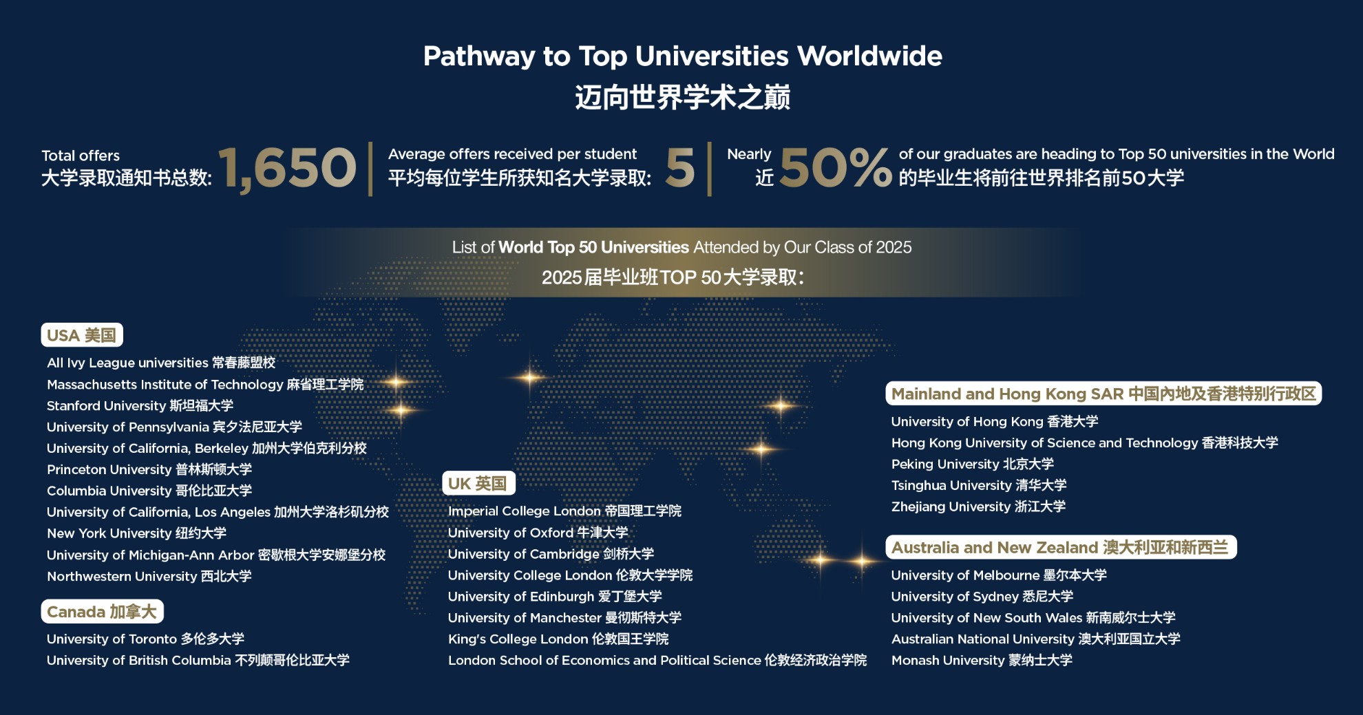 我们竭诚让每一位哈罗学子充分发挥个人潜能、培养个性特质,并为其提供丰富的锻炼机会,助力学生在名校申请和职业发展过程中脱颖而出。每一年,被牛津大学、剑桥大学、常青藤盟校及亚洲各大知名学府录取的哈罗毕业生比比皆是。