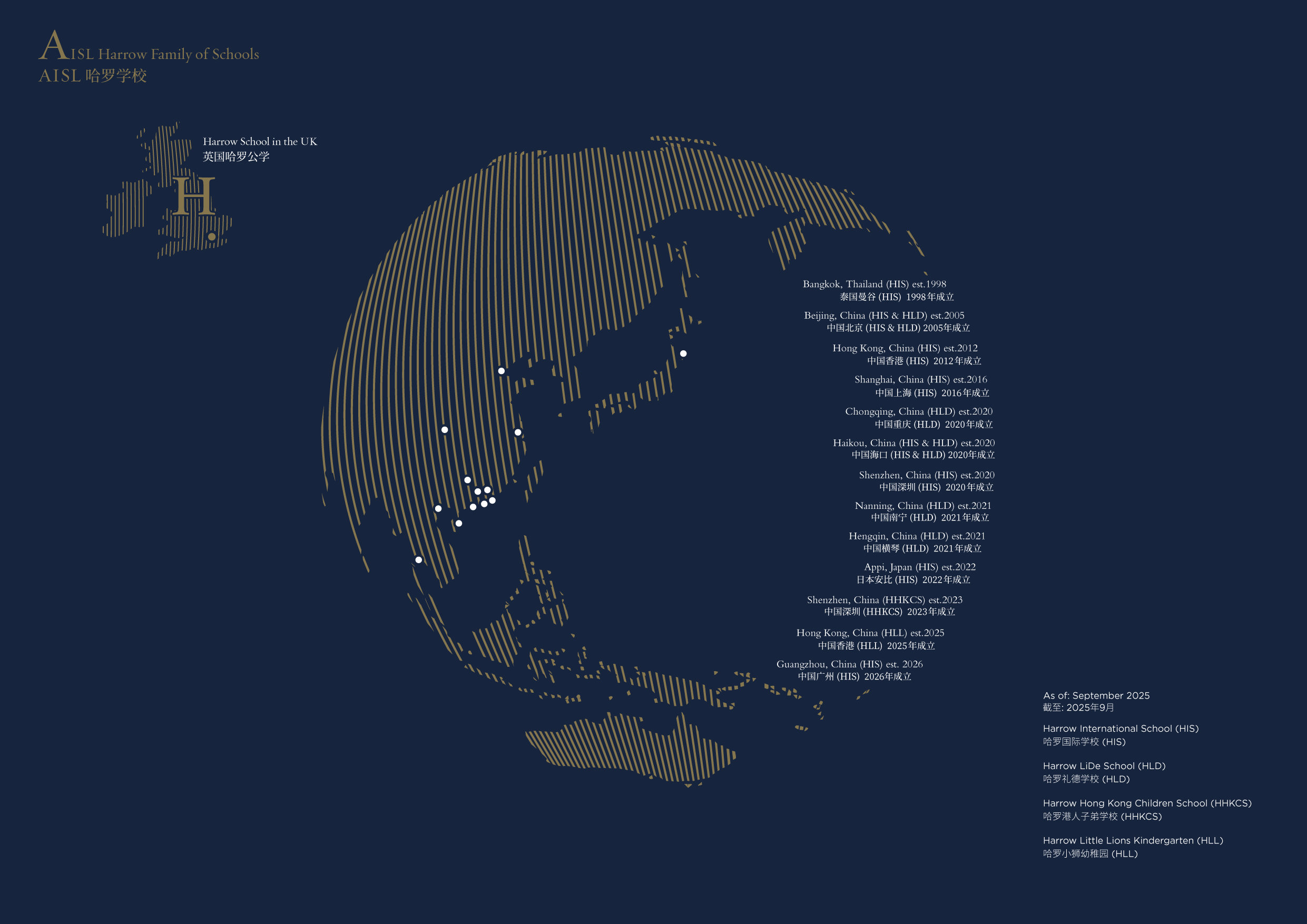 Drawing on the 450 years of extraordinary legacy and academic excellence of Harrow School in the UK, AISL Harrow Schools have been providing world-class education in Asia since the 1990s. Our successful AISL Harrow International Schools in Bangkok, Beijing, Hong Kong and Shanghai are highly regarded, with Shenzhen and Haikou joining the family in 2020 all offering exceptional education to prepare students with diverse background and abilities for a life of learning, leadership , service and personal fulfilment.